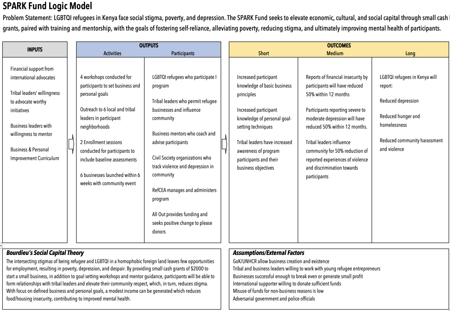 The intersecting stigmas of being refugee and LGBTQI in a homophobic foreign land leaves few opportunities for employment, resulting in poverty, depression, and despair. By providing small cash grants of $2000 to start a small business, in addition to goal setting workshops and mentor guidance, participants will be able to form relationships with tribal leaders and elevate their community respect, which, in turn, reduces stigma. With focus on defined business and personal goals, a modest income can be generated which reduces food/housing insecurity, contributing to improved mental health. Entrepreneur skills further enhance mental health by suggesting a more positive future.