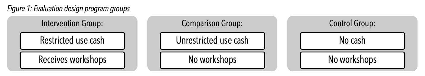 The evaluation design for this project is to gauge the effectiveness of the SPARK Fund program. Therefore, a pre/post design with two comparison groups will be employed. The first comparison group will receive unrestricted one-time cash grants of an equal amount as the intervention group, but not the business and goal setting workshops, nor will they be required to start a business. The second comparison group will act as a control and receive no cash or training; simply the pre/post testing. This design will allow a more complete understanding if the observed change can be attributed to simply the infusion of funds or if a more systemic change occurs when the cash is paired with business mentorship and personal goal setting. Having an intervention group plus two comparison groups should minimize threats to validity. However, selection bias will still be a concern. Participants who have the motivation and drive to submit a business plan and start a business may be more likely to succeed even in the absence of the program.